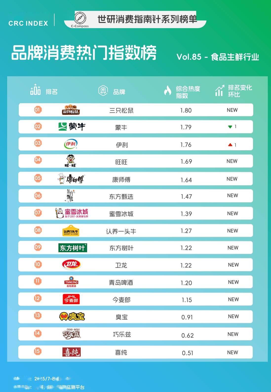 江苏城市足球联赛,江苏足球联赛,足球赛程,积分榜,城市足球队,业余足球,聚焦2025江苏城市足球联赛,提供实时赛程、积分榜、队伍信息、直播入口与报名指南,汇聚全省热爱足球的城市代表队,打造属于江苏人的足球狂欢!本次监测周期内,三只松鼠,蒙牛和伊利分别以1.80、1.79和1.76的综合热度指数位列榜单前三。