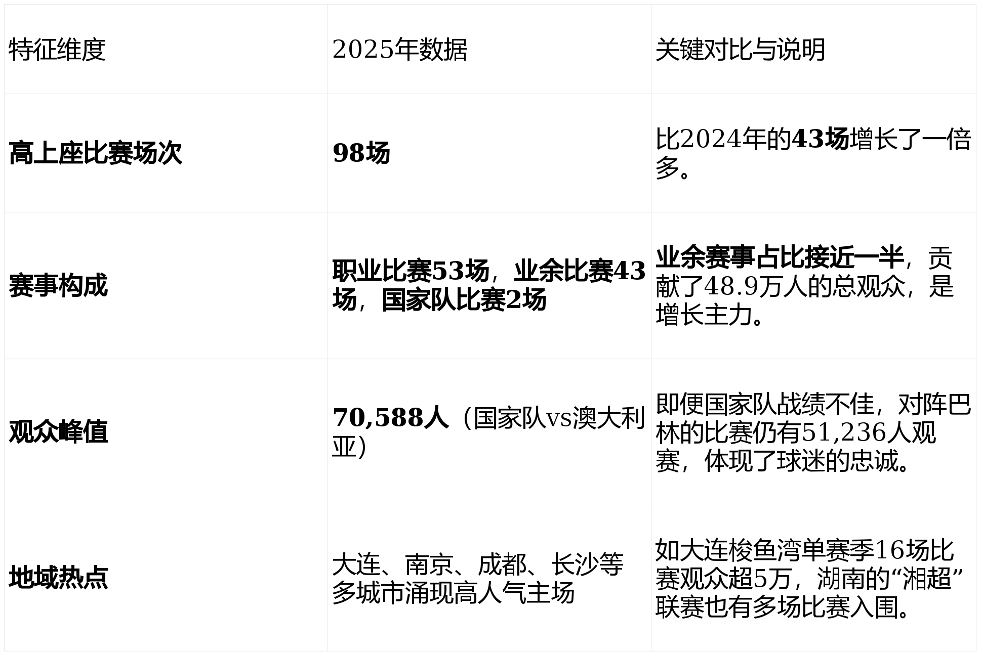 :高上座赛事不再局限于少数几个传统足球城市。从沿海的江苏、辽宁,到中部的湖南、江西,再到西部的四川、内蒙古,都出现了单场超4万人的业余赛事-1。这反映了足球热情正深入中国腹地,