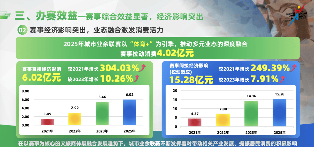 一年比一年更成熟的办赛模式,也更好地挖掘出了赛事的经济影响力并且激发出了消费活力。报告中的数据显示,2025年,城市业余联赛以“体育+”为引擎,推动多元业态的深度融合,赛事拉动消费4.02亿元。此外,赛事直接经济影响达到6.02亿元,较2021年增长304.03%;而赛事间接经济影响达到15.28亿元,较2021年增长249.39%。