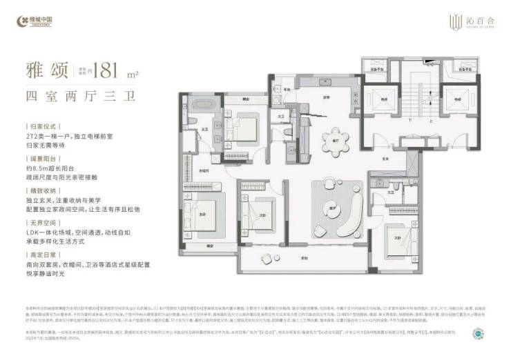 178㎡ & 181㎡ 四房两厅三卫:主人套房尊享独立卫生间,多代同堂互不干扰,彰显大户风范。
